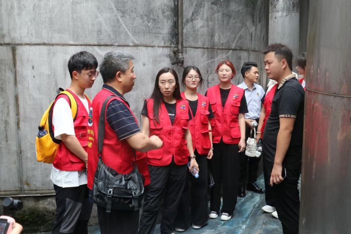 圖為實踐團成員參觀父傳子酒業醬酒密閉發酵儲存罐(夏茂程 供圖)