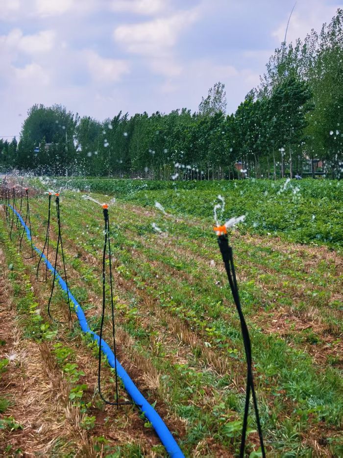 面對干旱、市場波動與勞力短缺的多重挑戰(zhàn),當地農戶也在積極擁抱新技術,尋求破局之道。實踐團發(fā)現,當地中藥材種植方式正進行著一場悄無聲息的改革。中藥材種植過去主要依靠手工勞作,如今卻有不少農戶用上了電子噴霧器、燃油機等農機設備。"現在打藥輕松多了,不用再背著重桶滿田跑",一位正在操作噴霧器的村民笑著說。一些大型的規(guī)模化種植區(qū),有專業(yè)的操作員正在操控無人機進行農藥噴灑。同時,在分散的小塊藥田里,有不少農戶開始使用滴灌、地插等設備進行灌溉,既降低了人工成本,又能有效緩解長期缺乏降雨而帶來的干旱問題。這些變化雖小,卻體現了現代農業(yè)技術在鄉(xiāng)村的落地生根。