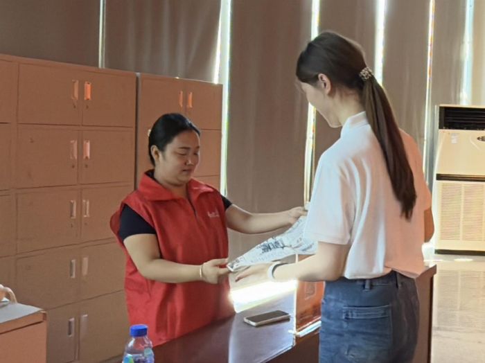 圖為實踐團(tuán)成員為紀(jì)念館工作人員贈送由團(tuán)隊成員制作的文創(chuàng)產(chǎn)品。常馥珺 供圖