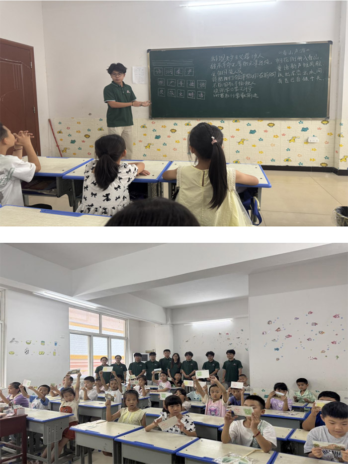 “我們是共產主義接班人,繼承革命先輩的光榮傳統……”教室里,孩子們用稚嫩而清晰的聲音跟唱《我們是共產主義接班人》,在紅歌中感受普通話的韻律之美。詩詞朗誦環節,成員們選用了自主創作的,以普通話推廣與商南文化為主題的詩歌《春山聲渡》,帶領孩子們逐字逐句練習發音,體會中華詩詞的韻味。此外,團隊還設計了互動識字游戲,通過卡片配對、小火車詞語接龍等形式,幫助孩子們鞏固所學知識,讓語言學習充滿樂趣。