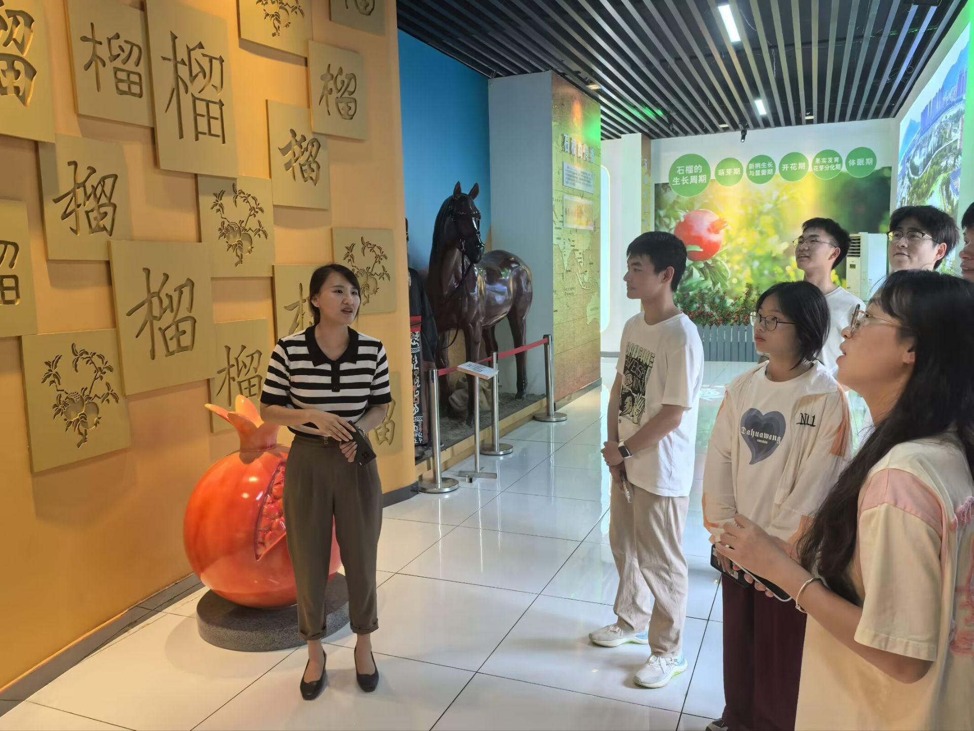 接著,帶著對特色農(nóng)產(chǎn)品產(chǎn)業(yè)的探索熱情,實踐團隊來到了亞太集團,專門對久負盛名的懷遠石榴產(chǎn)業(yè)展開深入探索,在相關負責人的帶領下參觀了獨具特色的亞太石榴博物館。這座博物館宛如一部立體的石榴產(chǎn)業(yè)發(fā)展史,生動形象地展現(xiàn)了石榴產(chǎn)業(yè)從起源到如今的完整發(fā)展脈絡。館內陳列豐富,不僅詳細展示了石榴的起源地、傳播路徑,追溯了石榴在歷史長河中的文化印記,還系統(tǒng)介紹了石榴的多重價值與豐富功效——從食用價值到藥用功效,從觀賞價值到文化寓意,一應俱全。