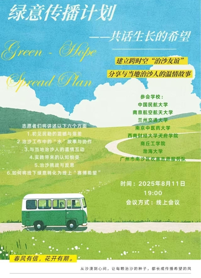 8月11日,“從民勤綠洲中探尋治沙精神”實踐隊還聯(lián)合了多個高校和廣州市南沙區(qū)歡喜志愿服務(wù)隊展開故事和經(jīng)驗分享“綠意傳播計劃——共話生長的希望”線上圓桌會議。
