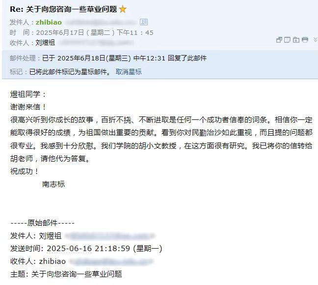 (圖為南志標(biāo)院士給隊長劉煜祖的回信)