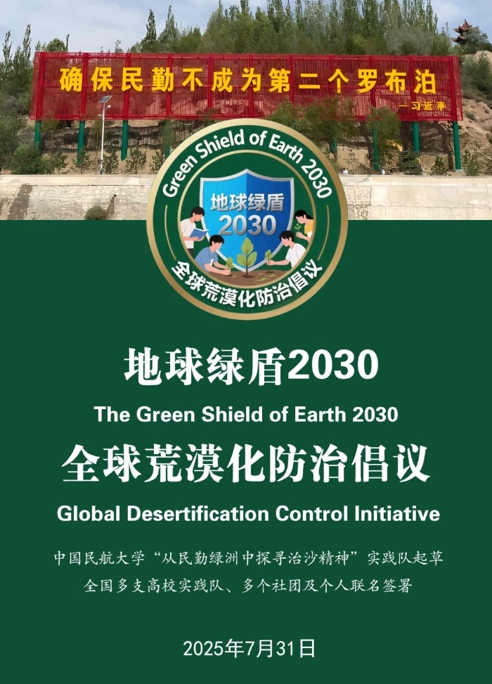 《倡議》是由中國民航大學(xué)“從民勤綠洲中探尋治沙精神”實踐隊草擬,于7月22日簽署,7月31日正式發(fā)布。該倡議旨在宣傳全球荒漠化防治行動,呼吁青年為全球荒漠化防治行動貢獻(xiàn)力量。它以民勤“沙漠綠楔”生態(tài)地位為引,揭示防沙治沙的緊迫性;嵌入民勤人人治沙的動人故事,突出堅韌不拔接續(xù)相繼的精神力量;并期望通過科研共享、實踐協(xié)同、文化聯(lián)結(jié)三大支柱將民勤經(jīng)驗升格為全球荒漠防治協(xié)作網(wǎng)絡(luò)。實踐隊制作并于8月2日發(fā)表了相關(guān)宣傳片。截至7月31日,已有43支高校實踐隊,8個高校環(huán)保類、公益類社團(tuán),4個地方公益發(fā)展機(jī)構(gòu)共2600余人參加了倡議。