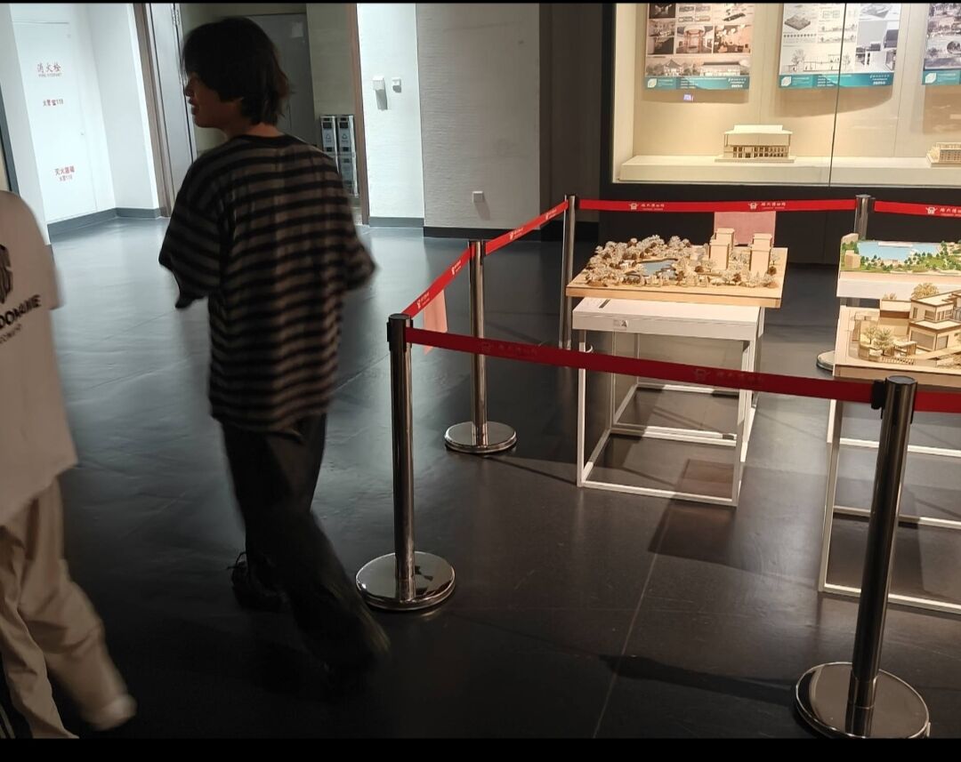 文明的回響終在建筑展區沉淀。四組精微模型矗立白臺之上:黛瓦飛檐的中式庭院環抱假山池魚,現代廊橋跨躍鏡面水域,每處窗欞雕刻、喬木栽植皆可細辨。背景墻懸掛的古建圖志與微縮模型構成雙重敘事,而一道印有"文明參觀 禁止觸摸"的紅色隔離帶,恰成為最富哲思的展品——它丈量著觀眾與文物的最佳距離,提醒我們以目光代替觸碰,在敬畏中讀懂榫卯間的智慧密碼。