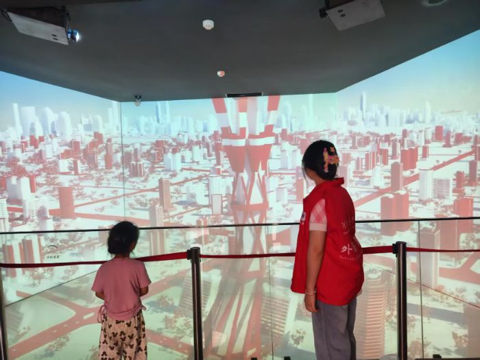 接著,小組的腳步轉(zhuǎn)向了二七塔,二七紀(jì)念塔矗立于鄭州二七廣場,其雙塔并肩的獨(dú)特造型,宛如凝固的史詩,無聲訴說著那段波瀾壯闊的歷史。實(shí)踐小組成員懷著崇敬的心情步入塔內(nèi),在講解員的引導(dǎo)下,開啟了這場紅色之旅。塔內(nèi)各層展覽以豐富多樣的形式呈現(xiàn)歷史:泛黃的老照片記錄下京漢鐵路工人大罷工的珍貴瞬間;銹跡斑斑的革命物件承載著先輩們的不屈意志;逼真的場景復(fù)原生動(dòng)再現(xiàn)了工人階級(jí)團(tuán)結(jié)抗?fàn)幍恼鸷硤雒妗T诙咚牡谒膶?ldquo;共生”,實(shí)踐團(tuán)隊(duì)觀看了展示鄭州這座城市發(fā)展與變遷的視頻。梁文燦和單思佳正全神貫注地盯著放映的視頻,認(rèn)真聽著視頻里的介紹,她們對(duì)鄭州的歷史有了更深刻的了解。