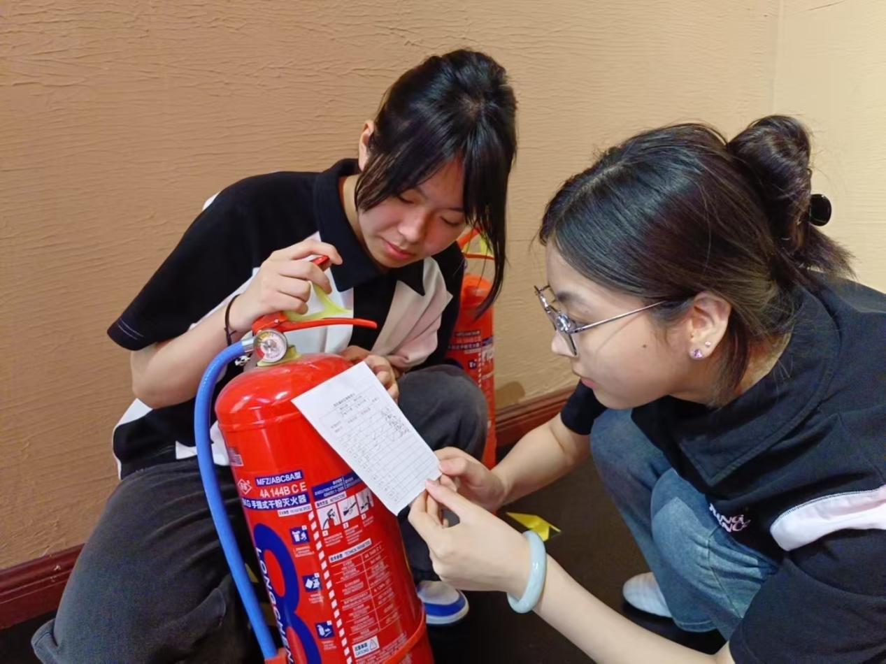 圖為實(shí)踐團(tuán)成員檢查消防器材