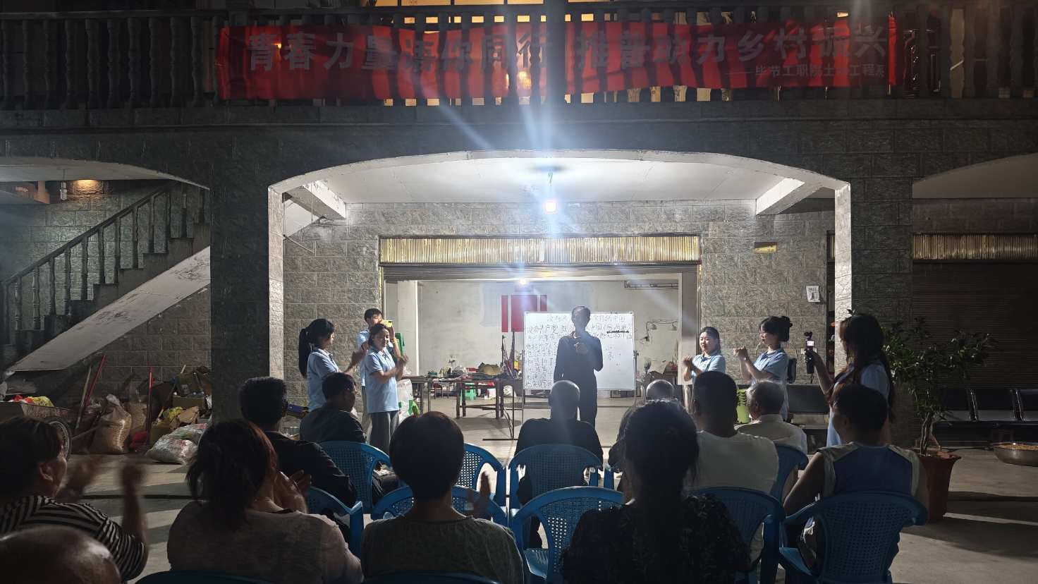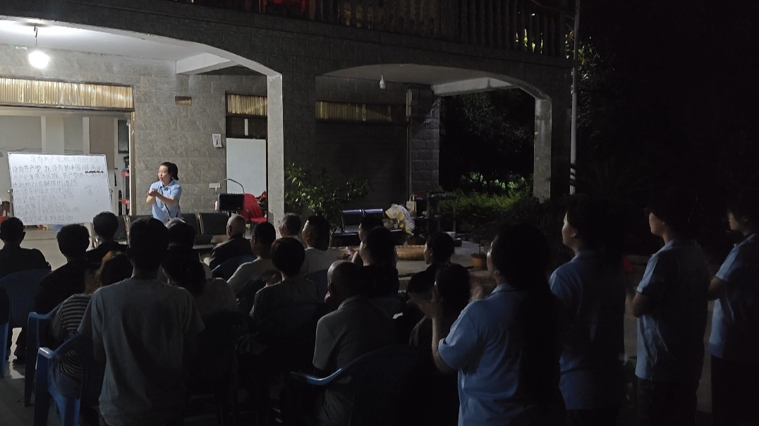 夜幕下,教學場地亮起溫暖的燈光,村民們身著日常服裝與身著藍色隊服的實踐隊隊員們圍坐成圈。前排幾位年長者專注地看著歌詞,實踐隊隊員們身著藍色隊服站在身后,所有人的目光都聚焦在臨時搭建的教學展板處。