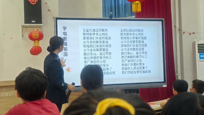 國家象征是公民責任的起點。隊員高羽迪與雍秦勤共同開展國旗、國歌、國徽知識宣講,從國旗的五星設計寓意、國歌《義勇軍進行曲》的創作背景,到國徽上谷穗、齒輪的象征內涵,再到日常使用中的禮儀規范,二人用通俗語言系統講解,讓孩子們不僅認識國家象征的歷史意義與法律規定,更樹立起 “維護國家象征尊嚴” 的公民意識。