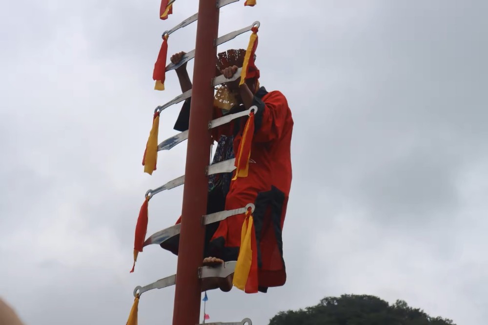 祭祀儀式在開闊的田地上舉行。現(xiàn)場插滿彩色標(biāo)旗,祭壇前整齊擺放著豬頭、雞等貢品。儀式中,巴代師傅們赤足登上鋒利的刀梯,在十余米高的梯頂跳起綹巾舞。陽光下,師傅們的身影與刀光交相輝映,口中吟誦的古老咒語在山谷間回蕩,以傳統(tǒng)儀式為苗族同胞祈求風(fēng)調(diào)雨順、五谷豐登。