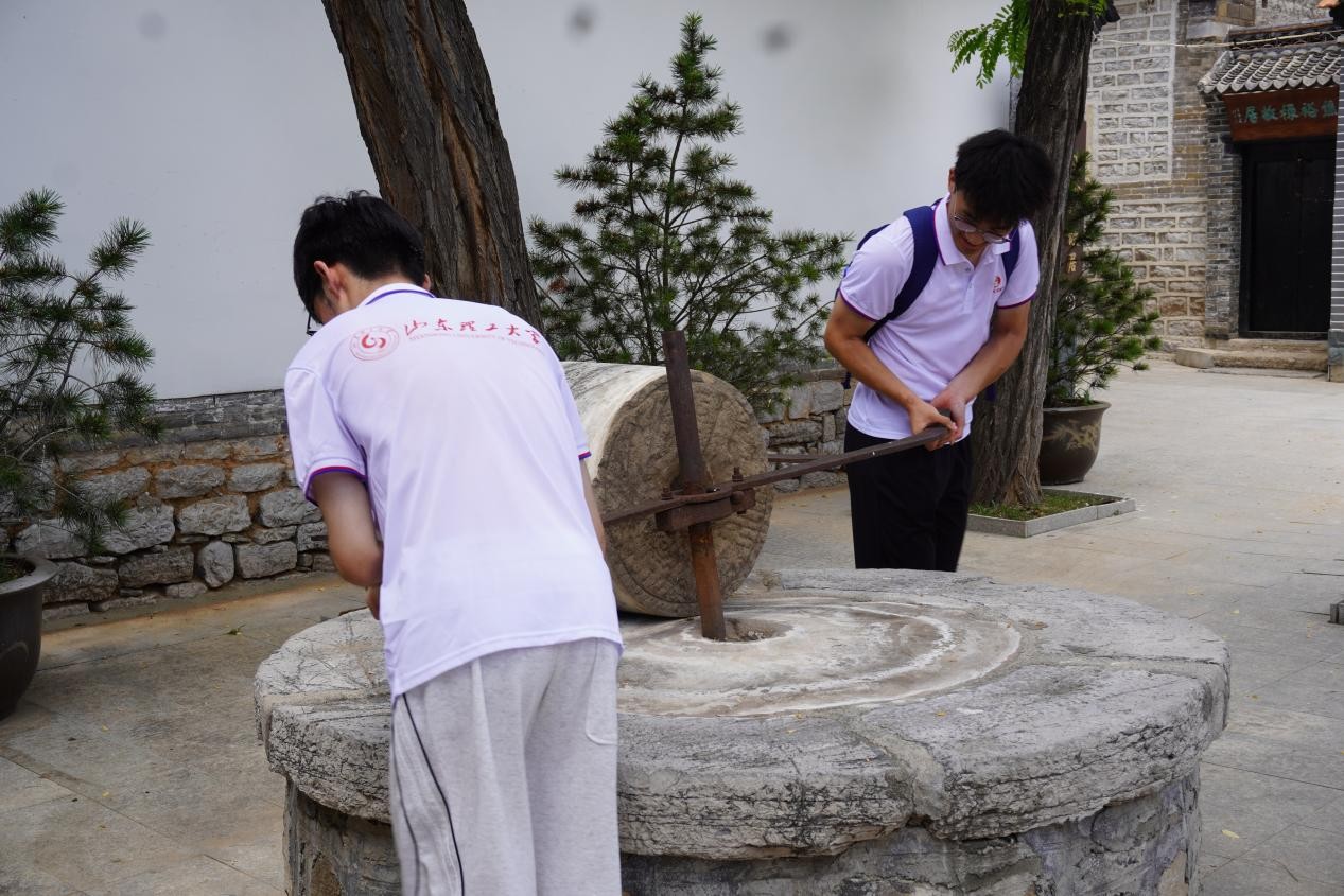 賀文博 攝抵達(dá)焦裕祿故居后,實踐團成員首先來到焦家油坊門前,對石磨盤進(jìn)行了體驗。在講解員的指導(dǎo)下,同學(xué)們親手轉(zhuǎn)動石磨盤,感受著其中蘊含的勞動艱辛與生活智慧。