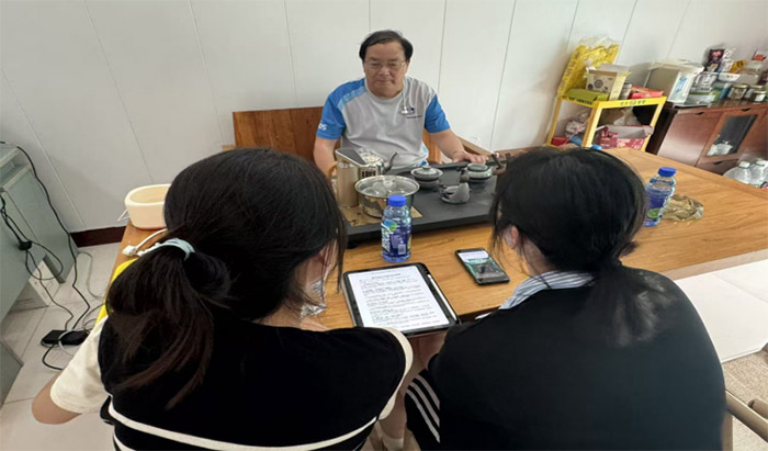圖為團隊成員與企業董事長交流。崔佳怡供圖