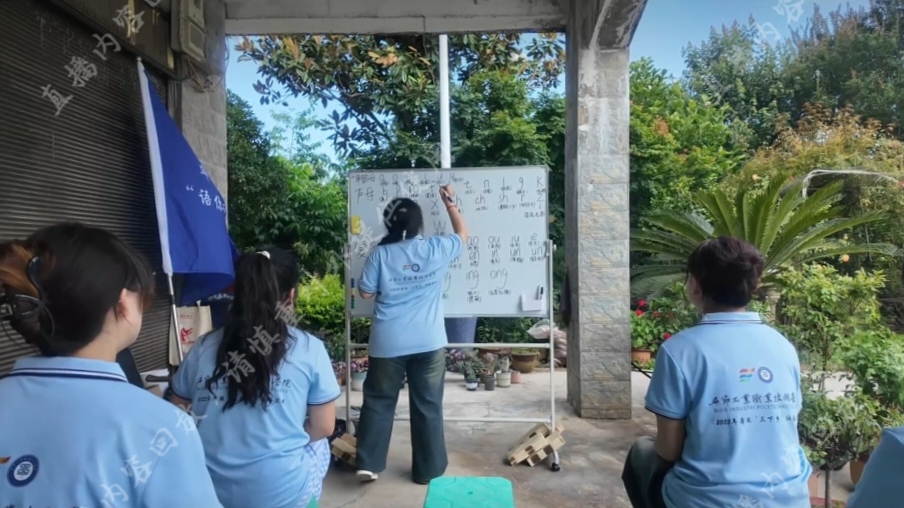 隊員們擦拭著額頭的汗水,將教學用的白板、白板筆一一擺放整齊。微風拂過揚起淺淺灰塵,在陽光里形成一道朦朧的光柱。教學場地周圍的的老人們在樹蔭下搖著蒲扇,好奇地打量著這群年輕人,他們布滿皺紋的臉上寫滿了期待。一陣熱風吹過,帶來遠處稻田里特有的泥土氣息,也吹動了隊員們手中嶄新的普通話教材,嘩啦啦的翻頁聲像是為即將開始的語言課堂奏響前奏。