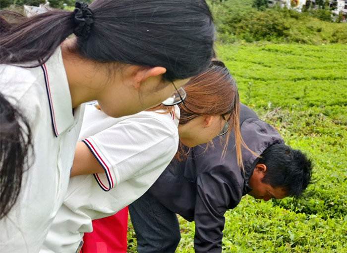 (圖為陳二福向團隊成員介紹黨參的生長條件甘蓉蓉供圖)