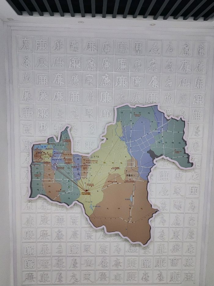 圖為展廳內廉潔文化墻,滿墻“廉”字與區域地圖彰顯廉潔文化的地域深耕
