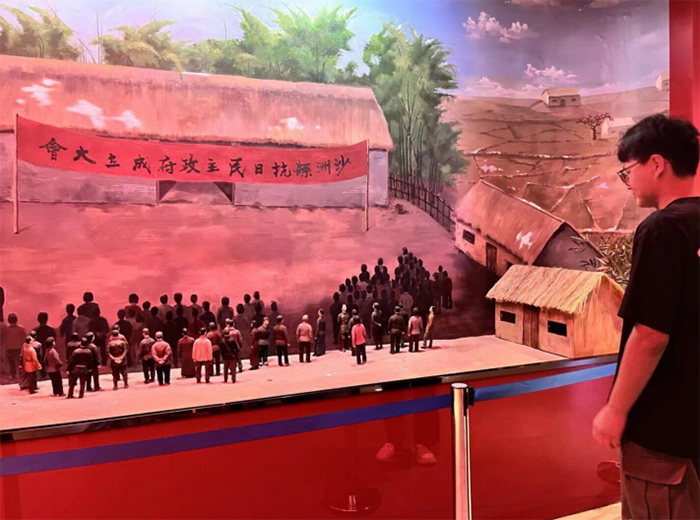 當(dāng)大家來(lái)到沙洲縣抗日民主政府成立大會(huì)場(chǎng)景復(fù)原區(qū)域時(shí),紛紛停下了腳步。眼前逼真的場(chǎng)景,仿佛擁有一種神奇的魔力,讓大家的思緒穿越時(shí)空,真切感受到了當(dāng)時(shí)人們對(duì)民主政府成立的熱切期盼。“那面紅色的橫幅,承載了太多人的希望,是革命先輩們奮斗的目標(biāo)指引,看著它,仿佛能感受到先輩們?yōu)榱诉@個(gè)目標(biāo)全力以赴的決心。”殷悅指著橫幅,向身邊的隊(duì)員分享著自己的感受。我也從這場(chǎng)景中,深切體會(huì)到先輩們?yōu)榻⒚裰髡䴔?quán)所付出的巨大努力,他們的初衷就是讓人民真正成為國(guó)家的主人,這種以人民為中心的理念,即便在如今,也依然激勵(lì)著我們,提醒我們要時(shí)刻把人民的利益放在心上。