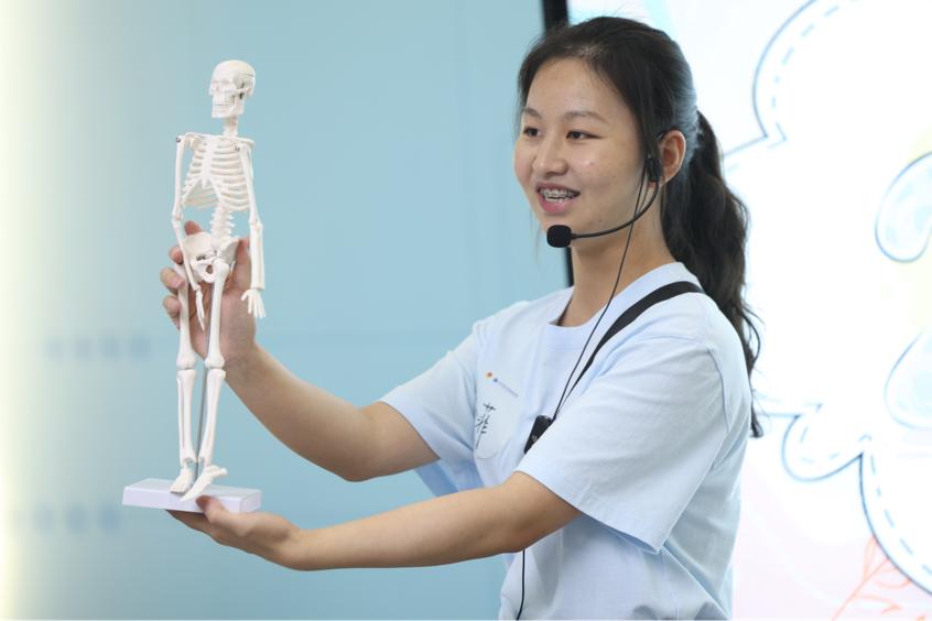 在人體科學展區,一副可拆解骨骼模型成為“明星教具”。團隊成員王曉菲輕輕轉動模型的肩關節,向孩子們演示:“就像積木搭城堡,我們的206塊骨頭互相連接,才能跑能跳。”活動現場,通過骨骼模型展示,隊員們深入淺出地介紹骨骼支撐的原理,還組織孩子們在實踐中認識人體骨架結構。團隊以寓教于樂的方式,帶領孩子們探索人體微觀世界,激發他們對生命科學的興趣,為科學啟蒙播下種子。
