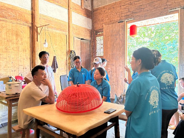 接著實踐隊跟隨村書記走進村中的蔡氏祠堂。歲月流轉,蔡氏宗祠依然巍然矗立,門楣上“源遠流長”的漢文匾額與梁枋間的鳳凰圖騰相映成趣。“祭祖大典時,畬漢同胞同唱《高皇歌》,共敬一炷香。”書記講述著“你中有我,我中有你”的鮮活歷史。