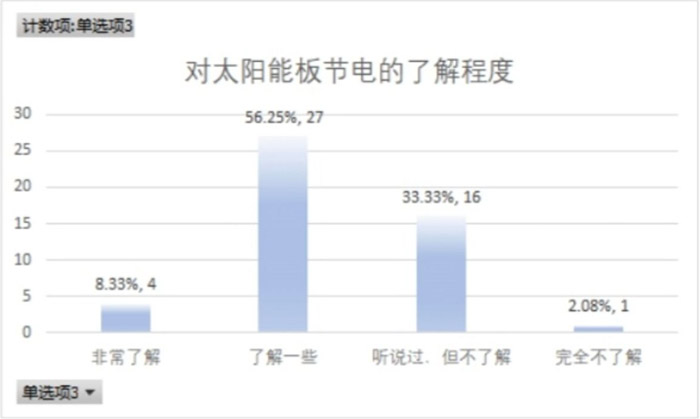 該團隊首先通過線上問卷調查進行初步調研。結果顯示,僅有8.33%的受訪居民表示“非常了解”太陽能板電池。在推廣建議方面,舊城區居民傾向于社區科普和小型太陽能設備推廣;新城區居民則更支持試點動態調節太陽能板(角度優化)及聯動物業展示節能數據。此次問卷旨在了解居民對太陽能應用的認知現狀和推廣建議。