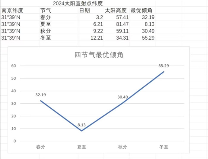 為提供科學安裝依據,團隊基于南京近三年的日照時長、太陽輻射量及不同季節太陽直射點緯度等數據,模擬計算了一年十二個月太陽能設備的最優傾斜角。團隊進行了數據查詢、計算及后期校驗工作,為后續固態與動態傾角發電量差異研究奠定基礎。