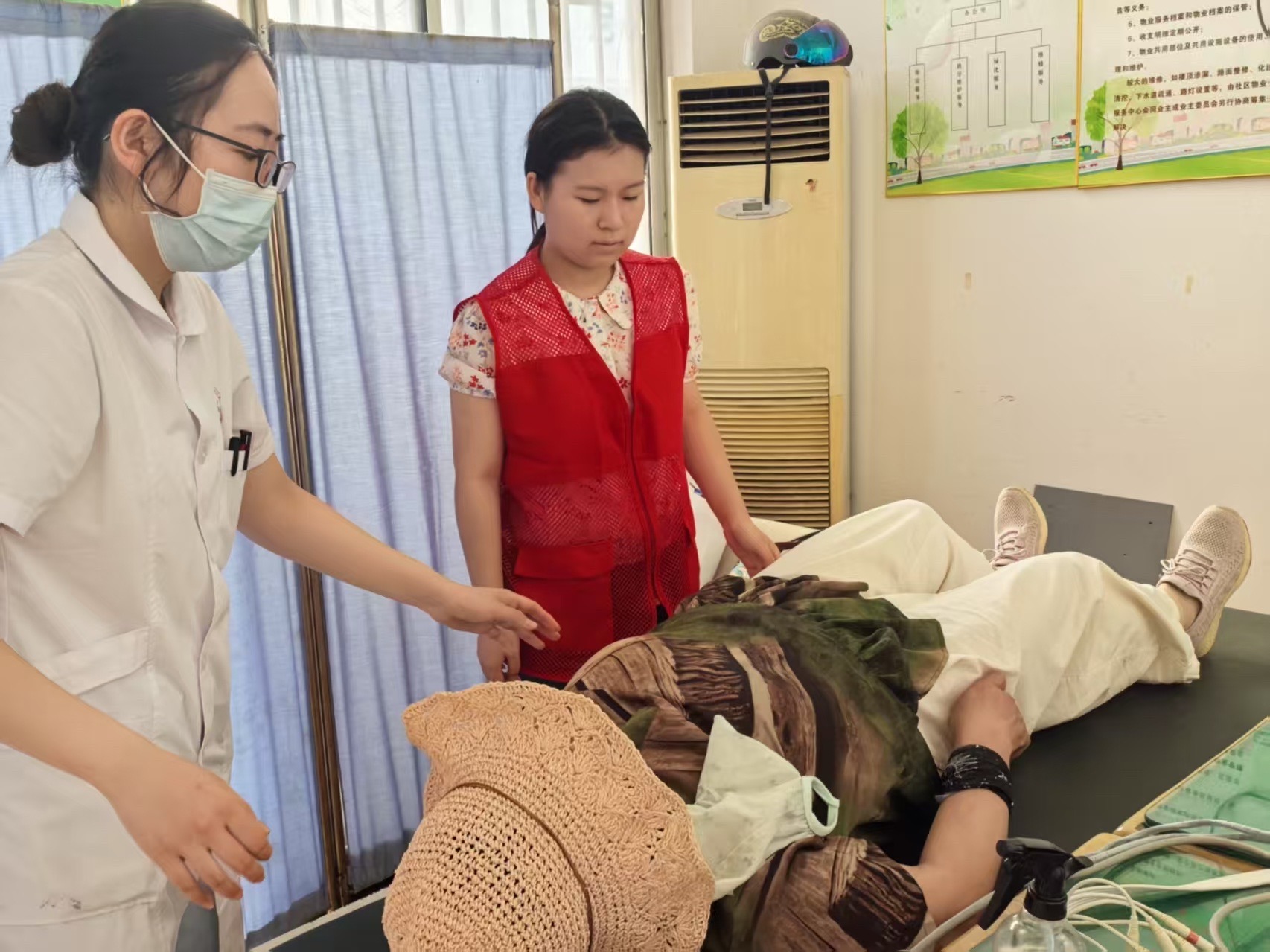 體檢工作上成員協助醫務工作者進行血壓、血糖、心電圖等項目的檢查并在旁為前來檢查的老人記下檢查數據,在雙方的相互配合下,為社區老人的身體健康提供了安全保障。
