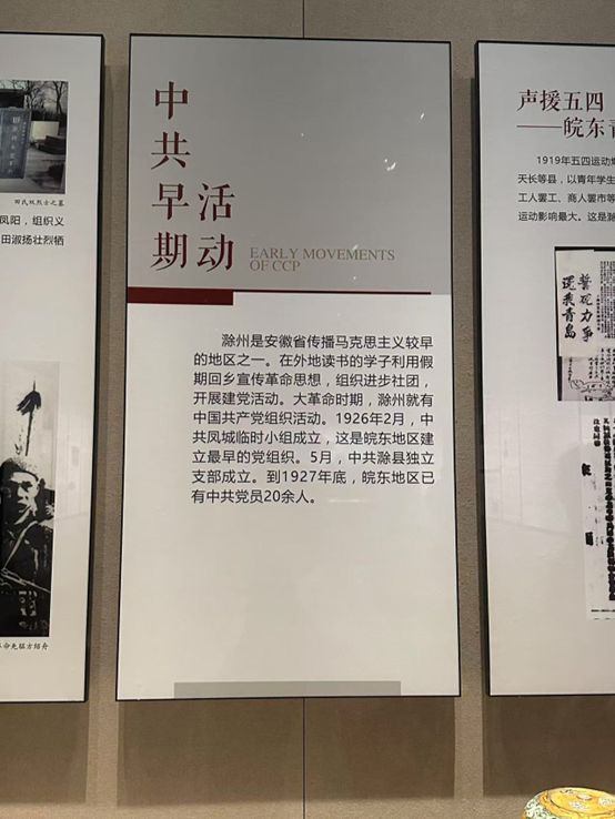 “中共早期活動(dòng)” 展板,講述了滁州傳播馬克思主義、建立黨組織的歷程,從中共鳳城臨時(shí)小組到滁縣獨(dú)立支部,革命火種在這片土地逐漸燃起 。