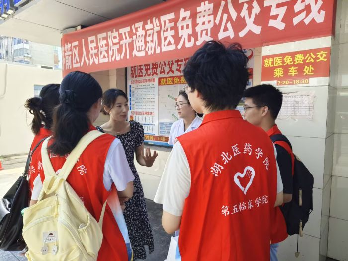 圖為茅箭區(qū)人民醫(yī)院相關(guān)醫(yī)護(hù)人員為隊員們講解就醫(yī)免費(fèi)公交。普依玲 供圖