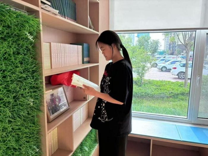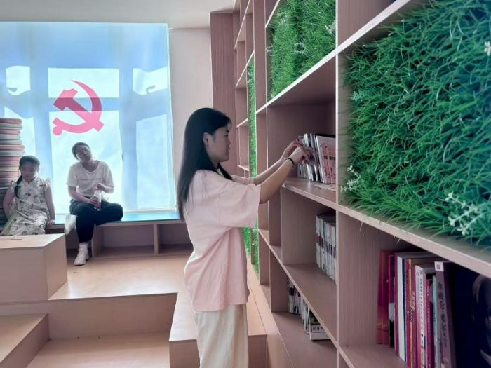 在社區圖書室閱讀圖書。大家分頭挑選書籍,有的專注研讀教育類書籍,有的翻閱兒童心理學讀物,輕聲討論互動技巧;還有人整理讀書筆記,分享實用知識點。書架間,書頁翻動聲與低聲交流交織。