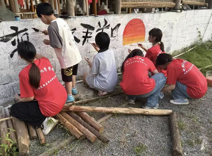 7月6日,實踐團隊提出墻繪打卡點的設想,為山莊增添了藝術標識和傳播力,對德和山莊小酒館進行改造提升。成員們和當地兒童以墻為幕,共同創作了一幅融合自然意境與人文情懷的主題墻繪。山莊莊主表示:“這幅墻繪更體現鄉土浪漫,打造了濃厚的鄉村韻味,相信未來這會成山莊的獨特打卡點!”