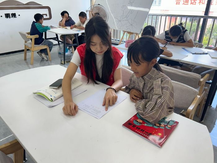 隨后的日子里,每天上午是固定的課業輔導時間。團隊根據學生年級和知識掌握程度分組教學。低年級課堂上,卡通插圖、繪本和兒歌被用來生動展示漢字結構、英語單詞和數學概念;高年級學生則在志愿者指導下,用思維導圖梳理應用題邏輯,結合生活實例理解英語閱讀。孩子們積極舉手提問的場景成為常態。“孩子們學習的積極性很高,有不懂的會及時問。”志愿者沙馬建平說。完成作業后,孩子們爭相展示成果,學習的自信心在點滴中積累。