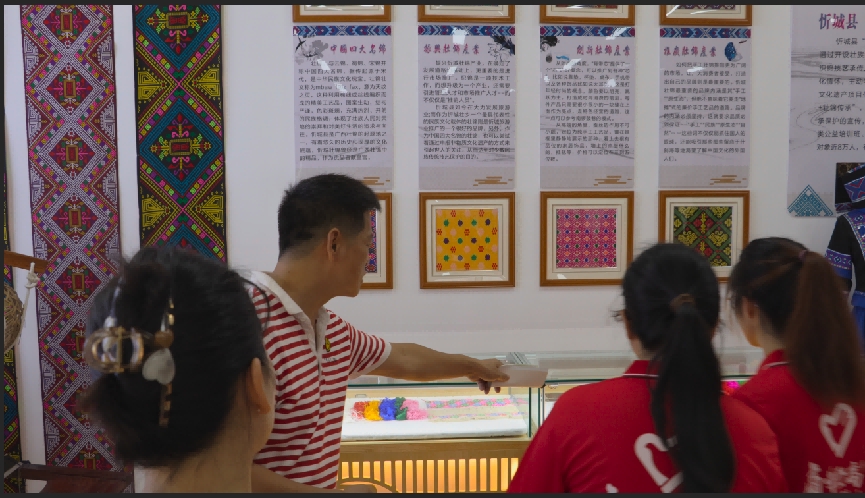 在接下來的行程中,在朱老師和曉玲老師的帶領下,團隊首先參觀了文化館內珍藏的壯錦。這些精美的壯錦作品展現了壯族傳統織錦工藝的獨特魅力。壯錦作為壯族最具代表性的傳統手工藝品之一,以其絢麗的色彩、精美的圖案和精湛的技藝聞名。