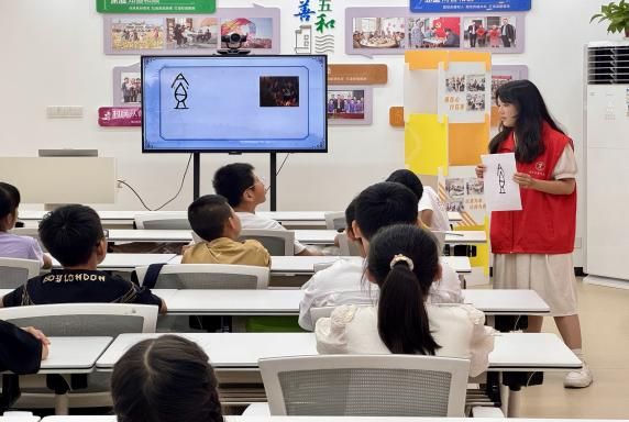實踐團隊事先準備了甲骨文卡片,以便更加直觀地為孩子們講解。“廈”字甲骨文線條錯落,恰似茅屋輪廓,孩子們瞬間讀懂杜甫詩中的“廣廈”所承載的庇護之意;“食”字的甲骨文像盛滿食物的容器,配合《賣炭翁》的講解,讓“身上衣裳口中食”的艱辛更顯具象;“善”字甲骨文蘊含古人對美好品德的期許,一筆一畫間,孩子們便可觸摸到“善”文化的根源。授課志愿者聲情并茂的講述,使生硬晦澀的古文字躍然紙上,讓最初對甲骨文懷有“畏難”情緒的孩子們輕松掌握。彤彤說:“每一個甲骨文都好像一副古代人的畫,今天講的‘善’字就是一只吉祥的小羊。”