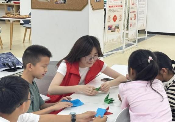 圖為團隊成員帶領孩子們折善愿千紙鶴。劉佳燁供圖。
