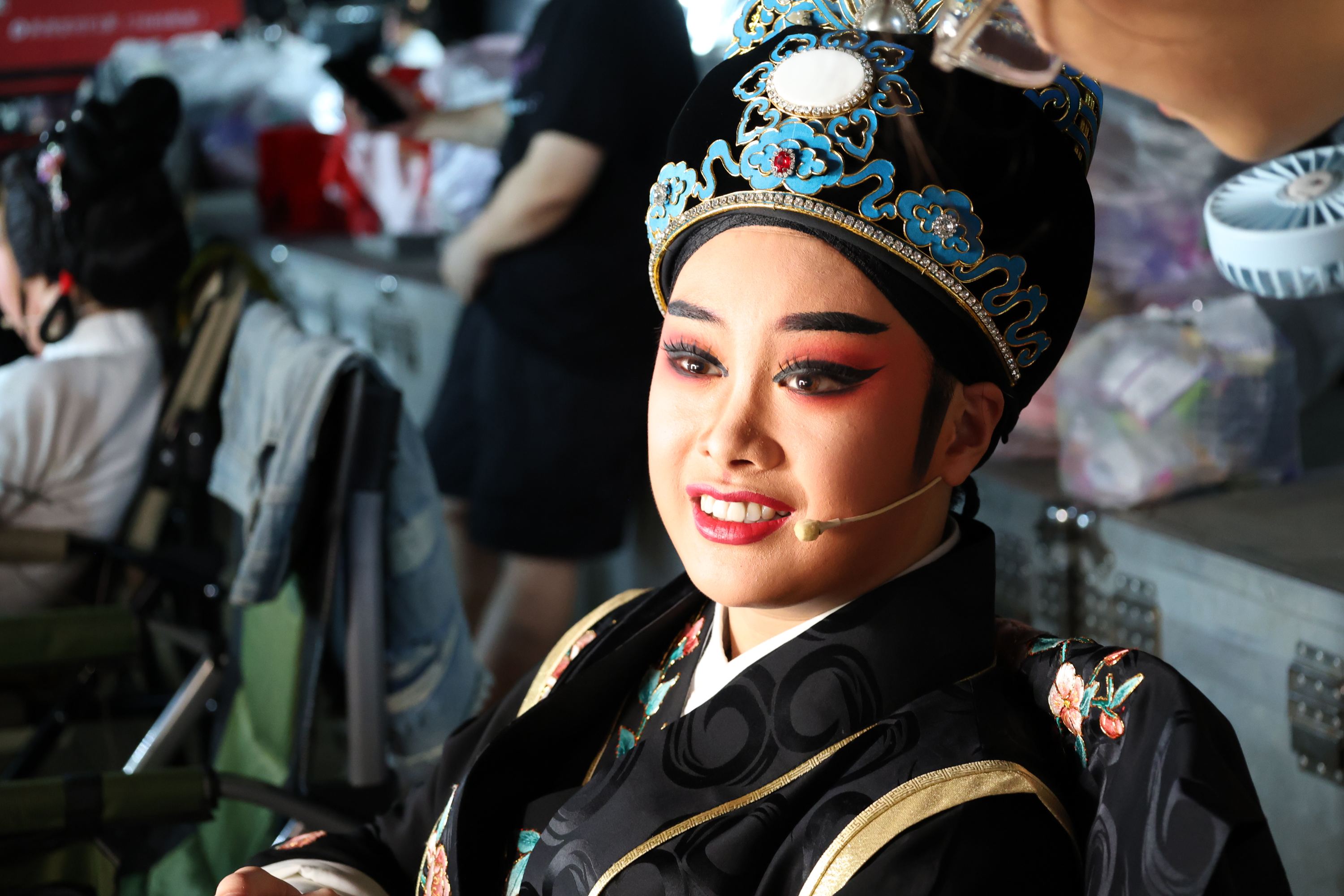 圖為團(tuán)隊(duì)成員在后臺(tái)采訪臨海市桔香越劇團(tuán)演員。李文彬 供圖