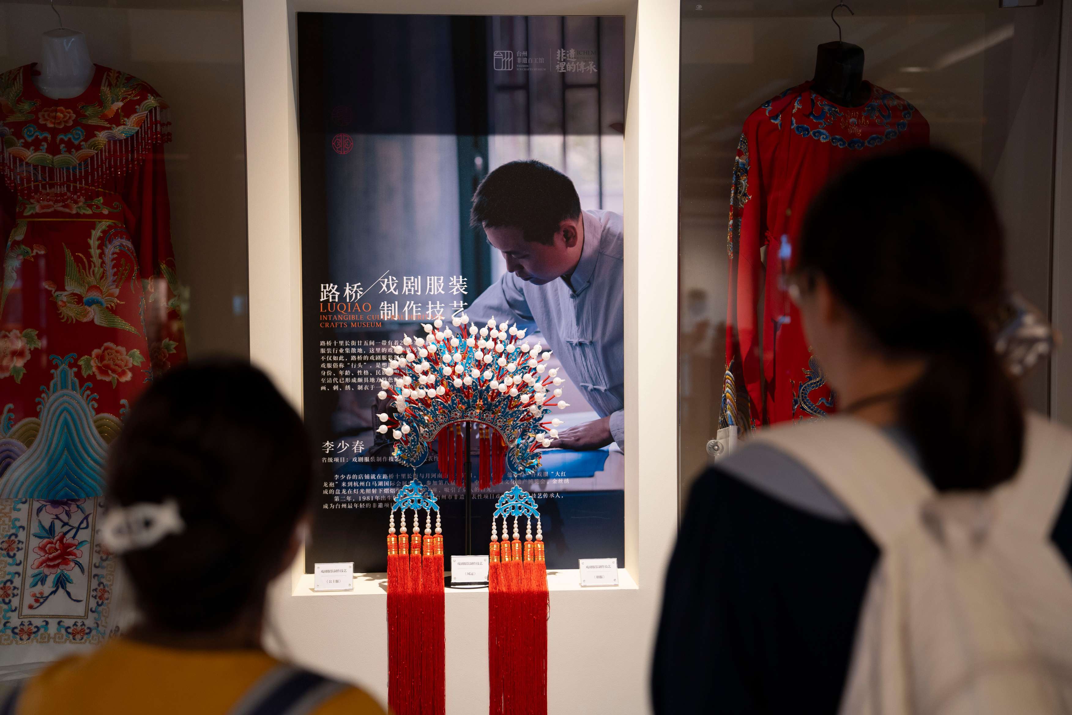 臺(tái)州十里長街的非遺百工館則呈現(xiàn)了另一個(gè)維度的發(fā)現(xiàn)。隊(duì)員們親手體驗(yàn)戲服刺繡,理解“一針一線皆戲魂”的匠造哲學(xué)。“戲服不是裝飾,而是越劇的血肉載體”,路橋戲服工作人員的闡釋讓隊(duì)員們重新認(rèn)知舞臺(tái)藝術(shù)的本真。從陶泥塑形到金銀線刺繡,這些民間工藝與戲曲美學(xué)的共生關(guān)系,構(gòu)成了越劇傳承的重要基礎(chǔ)。