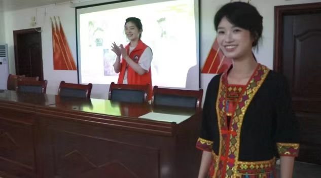 繼漢字與農耕文明的探索之后,團隊將目光投向沖頭村豐富的民族文化遺產。在青山環抱的村落里,黎族文化的獨特風情如同一座正待發掘的寶藏,一場別開生面的“黎族寶藏大作戰”主題趣味課堂隨即展開。志愿者通過黎族經典傳說“鹿回頭”導入教學,巧妙引導孩子們先運用方言生動復述故事,再精準轉化為普通話表達,在語言轉換中加深對黎族傳統文化的理解。在“黎族知識對對碰”環節,志愿者系統講解了各民族服飾飾品特點,并身著精美的黎族傳統服飾,近距離展示其獨特紋飾與精湛工藝,使孩子們直觀領略到黎族服飾所承載的深厚文化底蘊與藝術價值。隨后,孩子們化身為小小文化傳承者,分組協作,共同拼湊象征黎族精神的傳統圖騰,并親手繪制蘊含民族智慧的特色紋樣。這場沉浸式的文化探索之旅,有效深化了孩子們對黎族文化內涵的理解,鑄牢了他們對本土民族文化的認同感。