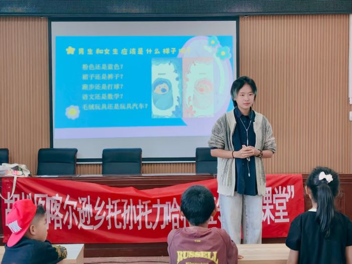 挑選玩偶巧堅冰性別偏見正消融 活動伊始,支教團白成莉老師巧妙設計互動環節,直指無形的性別刻板印象。“圖片上粉色和藍色的小寶寶,同學們覺得分別是什么性別呀?這些習以為常的“規則”在輕松開放的討論中被一一檢視。通過“刻板印象”中男女特征的舉例,結合現實情況孩子們對不同事物的喜愛。孩子們在對比和一遍遍思考中,重塑對性別的印象,“刻板印象”的冰川正在漸漸消融。在后續的問答成功挑選玩偶掛件中,再一次無形之中強化加深了課程重點——打破偏見。哈薩克族男孩葉爾多斯選擇了可愛的星星掛件;單車技術超過很多男孩的小女孩阿依則熱卻選擇了帥氣的小狗掛件。性別從來不是枷鎖,偏見才是。