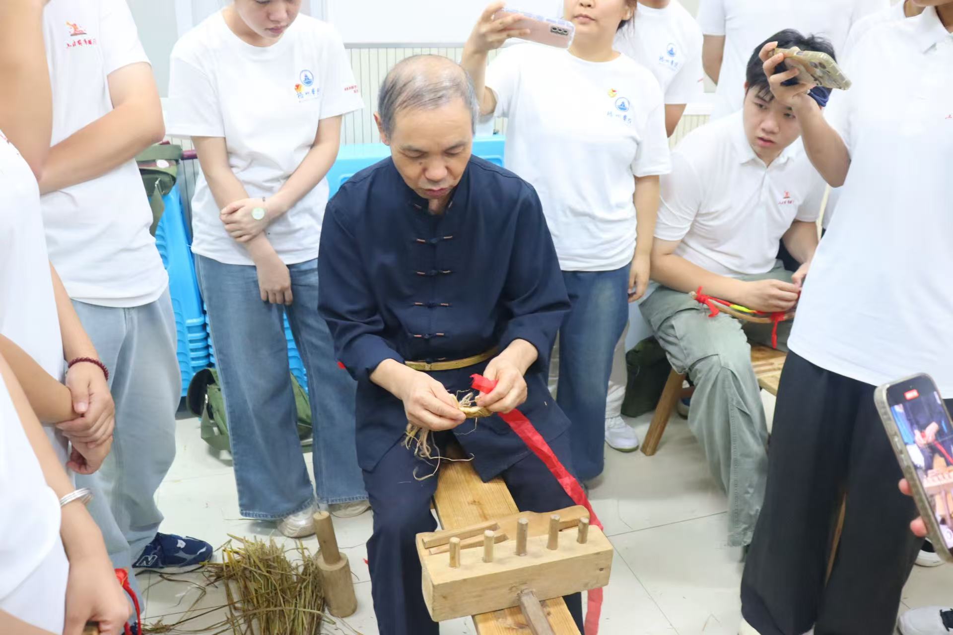 “編草鞋呀,把草搓成一股繩,來回交錯扭一扭,再用細(xì)繩來回穿一穿,齊活!”晚上,編草鞋的老師傅一邊手腳麻利地示范著,一邊向圍坐在身旁的隊員們耐心講解。在他的帶領(lǐng)下,師生們學(xué)習(xí)了如何用簡單的工具和材料制作草鞋,并親自動手實踐,每個人都親手編制了屬于自己的草鞋,在一搓一扭一穿中感受先輩艱苦奮斗的精神。