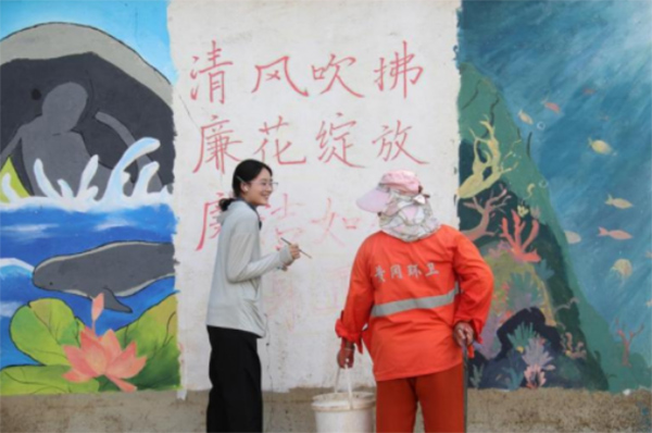 此次墻繪創作覆蓋黃州區新港路社區及遺愛園公園核心區域。志愿者們創新采用意象融合手法,在江豚擺尾、水草搖曳等靈動生態元素旁,巧妙融入蓮花綻放的優美圖案,同時搭配“清風吹拂,廉花綻放”等醒目標語。原本單調的墻面由此蛻變為集生態宣傳與廉潔教育于一體的多功能文化載體。現場可見,不少居民駐足觀賞時,會主動向同行者解讀畫面中的生態符號與廉潔寓意,讓墻繪成為流動的“教育課堂”。