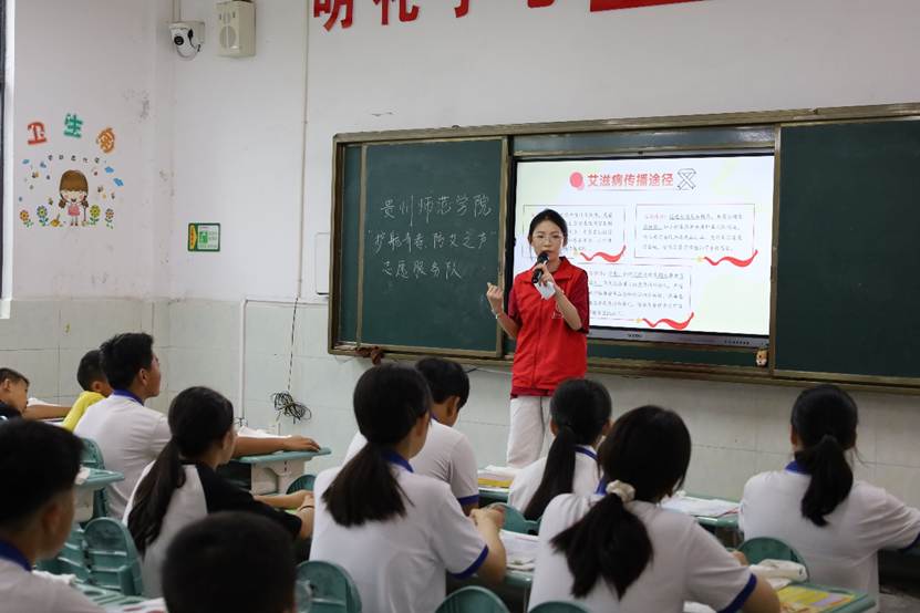 (圖為貴州師范學院“護航青春防艾之聲”隊員在中學進行禁毒防艾與青春健康綜合宣講。 鄒賢杰 供圖)