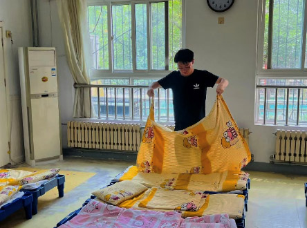 午休過后,實踐團成員在老師的帶領(lǐng)下走進幼兒園寢室。他們認真疊被子、整理床鋪,將寢具擺放整齊,讓寢室面貌一新。實踐團成員細致耐心,用實際行動為小朋友營造舒適居住環(huán)境。