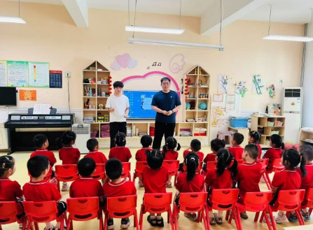 最后一天離開前的課堂上,實踐團化身“小老師”,借助多媒體,圍繞屏幕展示內(nèi)容,用生動講解和趣味互動,為小朋友們帶來趣味知識。小朋友們坐姿端正、積極回應。配合默契。