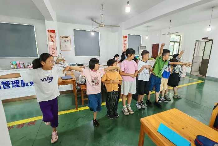 “上古有真人者,提挈天地,把握陰陽,呼吸精氣,獨立守神,肌肉若一。”古訓回響,稚子凝神,虎撲生風,鹿抵輕靈。實踐隊員以華佗五禽戲為引,帶領孩子們在熊晃猿躍間,體悟中華“天人合一”的生命智慧。