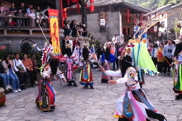 與此同時,不遠處的舊州小學創新性地設立了地戲培訓基地,將這一國家級非物質文化遺產引入日常教學。不同民族的學生——無論是漢族、苗族還是布依族——都踴躍加入地戲的學習隊伍。他們一起描畫臉譜、練習唱腔、操演身段,在古老的戲臺上演繹歷史故事,傳遞忠義精神。這一舉措,遠遠超越了單純的技藝傳授,成為了一座促進多民族文化交流與融合的生動橋梁。