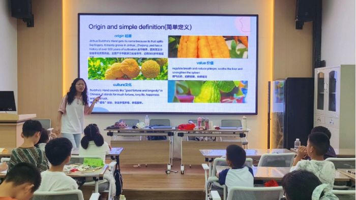 講解間隙,朱老師舉起手中的佛手模型,引導(dǎo)孩子們聯(lián)想這顆金果在日常生活中的身影。這一活動(dòng)引發(fā)孩子們的激烈討論,對(duì)于佛手的態(tài)度從好奇轉(zhuǎn)為了然,眼前的佛手漸漸與家中某個(gè)場景重疊——或許是奶奶晾曬佛手時(shí)的背影,或許是父母打包快遞時(shí)的忙碌,又或是餐桌上那杯帶著清香的佛手茶。那些藏在日常里的片段,都成為了理解家鄉(xiāng)產(chǎn)業(yè)的鮮活注腳。