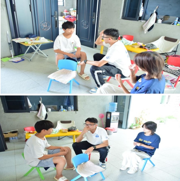 7 月 13 日清晨,實踐團成員分為 6支小隊,前往學校周邊 3個行政村開展家訪。在樊村一名學生家中,隊員看到墻上貼滿的獎狀。家長坦言:“孩子學習不錯,但總問讀書有啥用,我們也說不清楚。” 隊員結合自身求學經歷,用通俗語言解釋知識對個人發展的意義,并邀請學生參加晚間團課。走訪中,隊員記錄學生家庭詳細情況,如何具體幫助每一名學生,同時發出團課邀請。