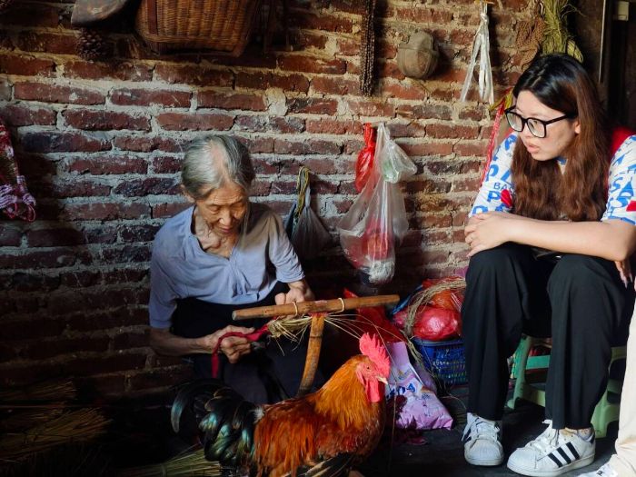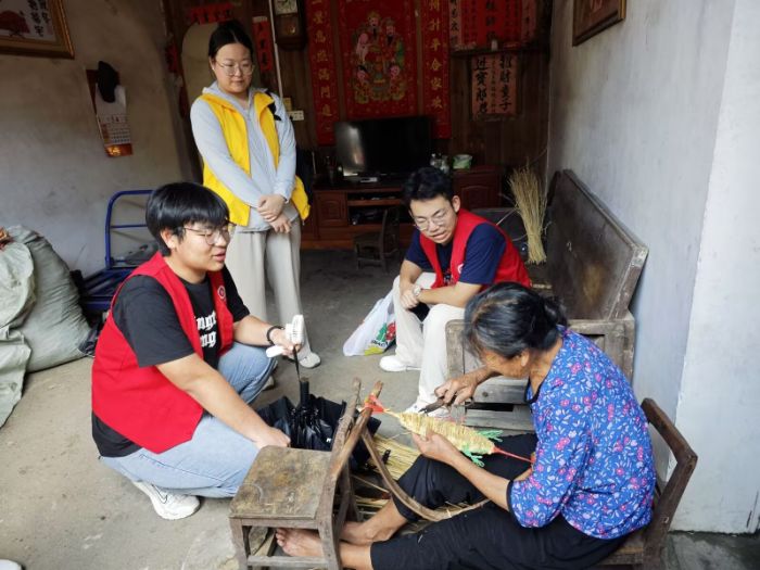 (圖為實踐團成員參觀熊村古鎮博物館 陸遠莉攝) 隨后,實踐團探訪了熊村古鎮的草鞋匠人阿婆。在老巷深處,阿婆的竹篾作坊里散發著稻草清香,她手指翻飛間演示著"搓繩-編底-織幫-鎖邊"四道古法工序。她向實踐團介紹:當年紅軍長征路過桂北,老百姓就是捧著這樣的草鞋支援隊伍。如今古鎮游客漸增,李阿婆將艾草編入鞋底創新防滑設計,"老手藝要傳下去,就得像這稻草一樣,既扎得牢根,也接得上新枝"。