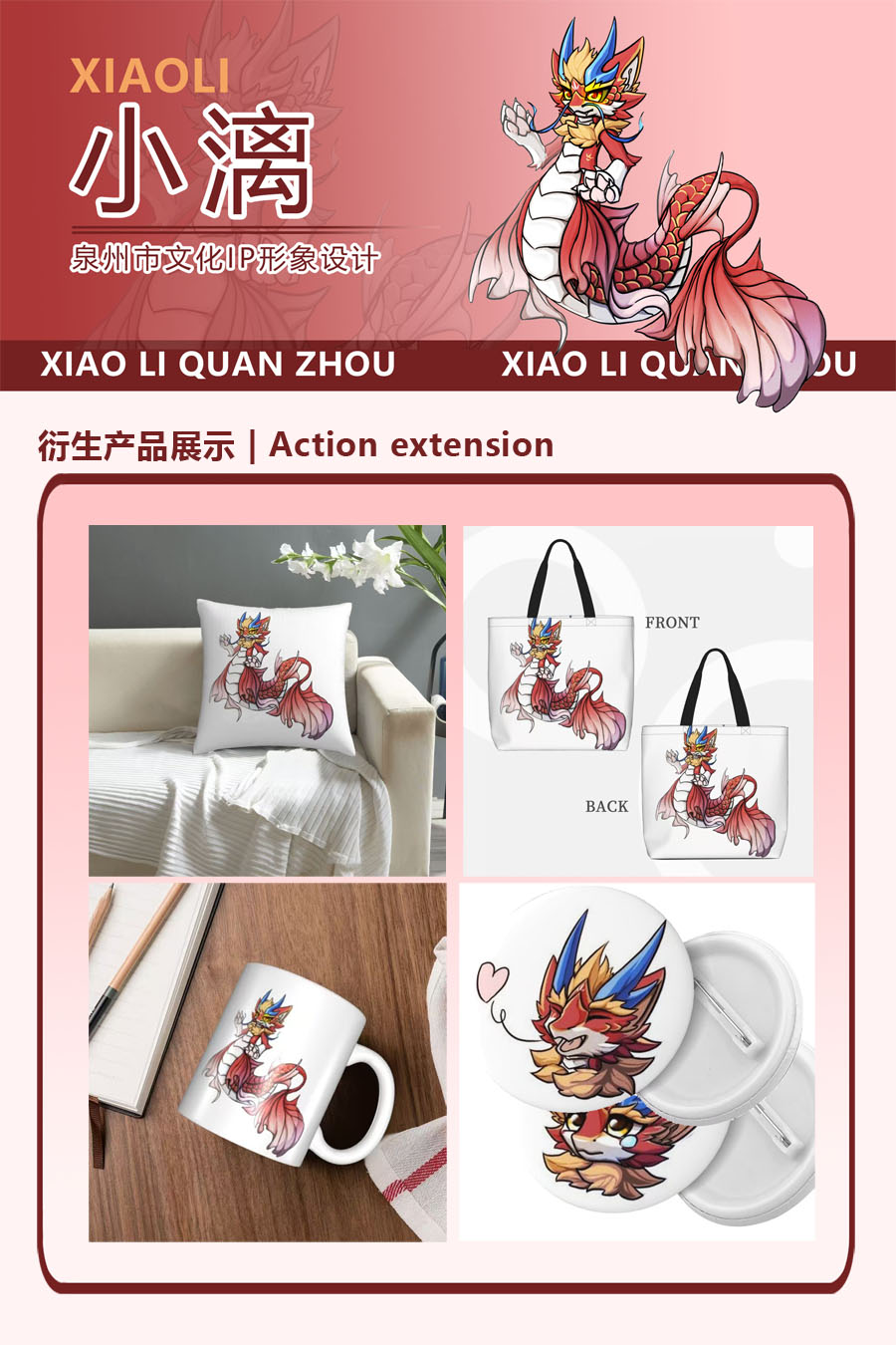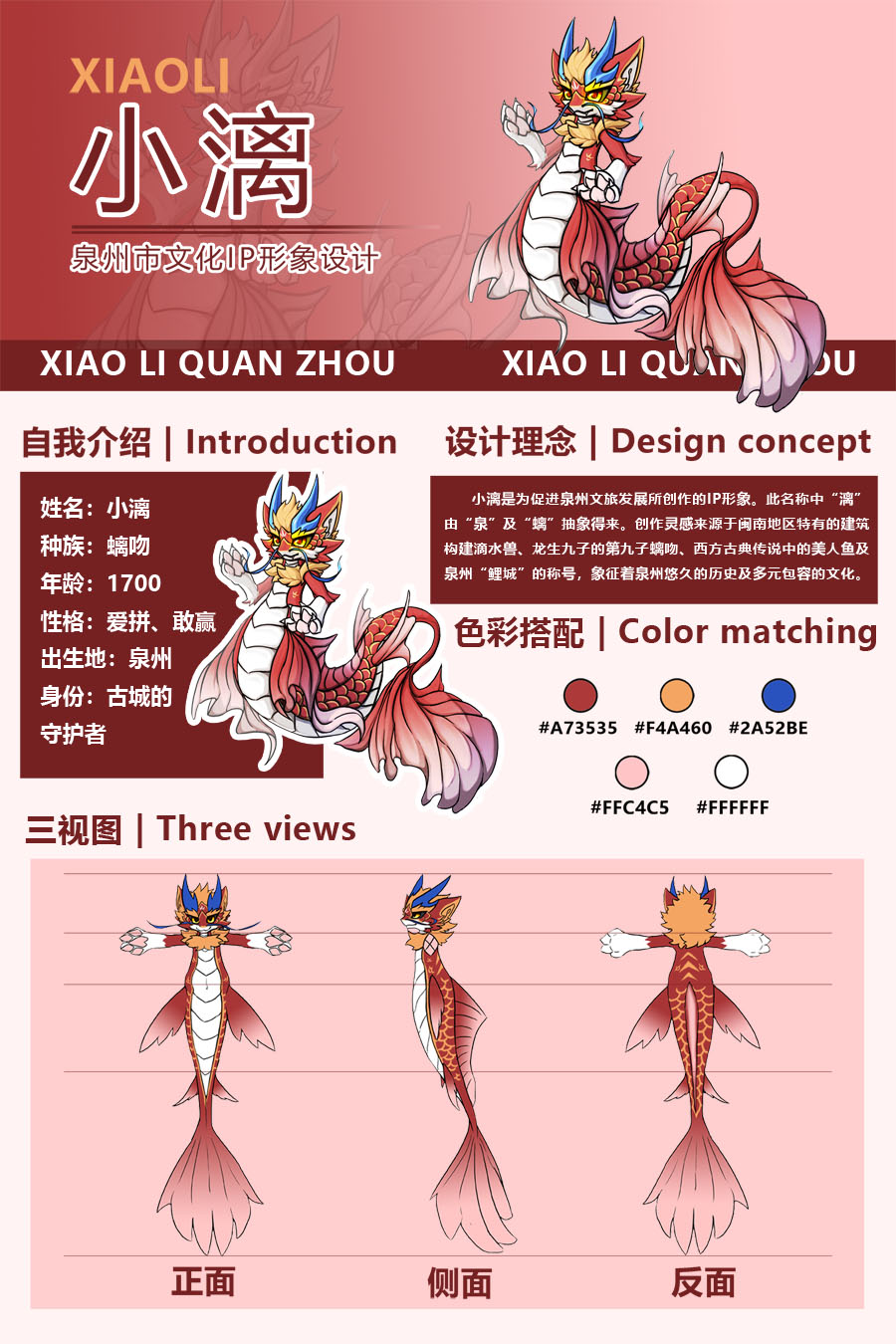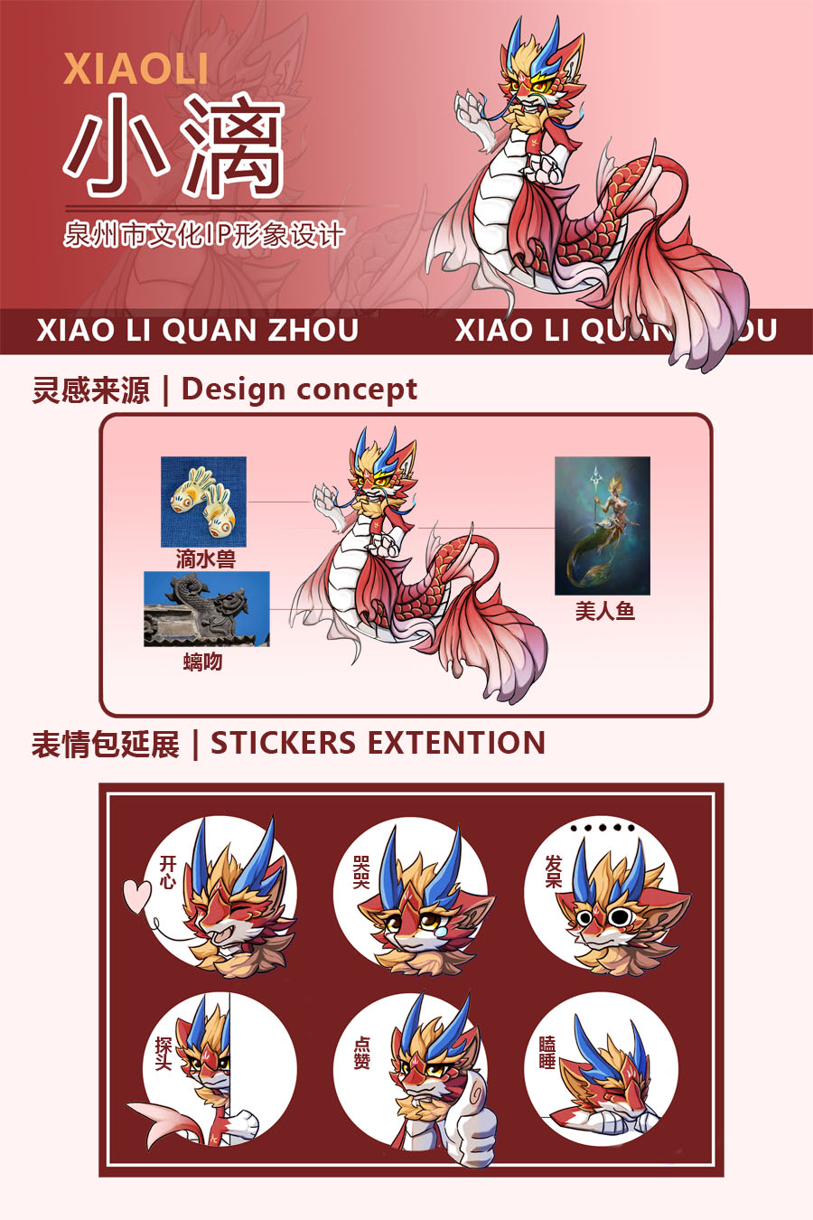 實踐隊在外形設計、配色選擇方面還查詢了大量相關資料并進行整合。為了IP形象被更多人尤其是年輕人所接受,實踐隊對當前網絡環境進行了一定的觀察,發現可愛的動物形象更容易被年輕人所接受,結合泉州“鯉城”的別稱,決定以中國傳統文化龍生九子中的第九子龍首魚身的螭吻為基礎,加上美人魚外形以及貓爪子使其看上去姿態更優美,外形更可愛。在配色選擇方面,在觀察了閩南傳統建筑常用的配色,結合泉州海上絲綢之路起點的地位,決定以閩南紅(#A73535)、刺桐黃(#F4A460)、海絲藍(#2A52BE)這三種常見的色彩為主,以白色、粉色等為輔,再結合滴水獸常見的花紋樣式進行設計。