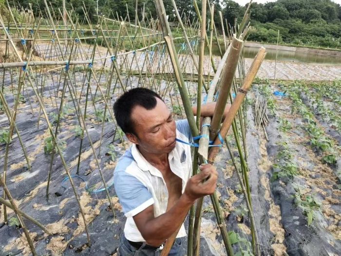 圖為謝慧清編苦瓜棚。謝向前 攝