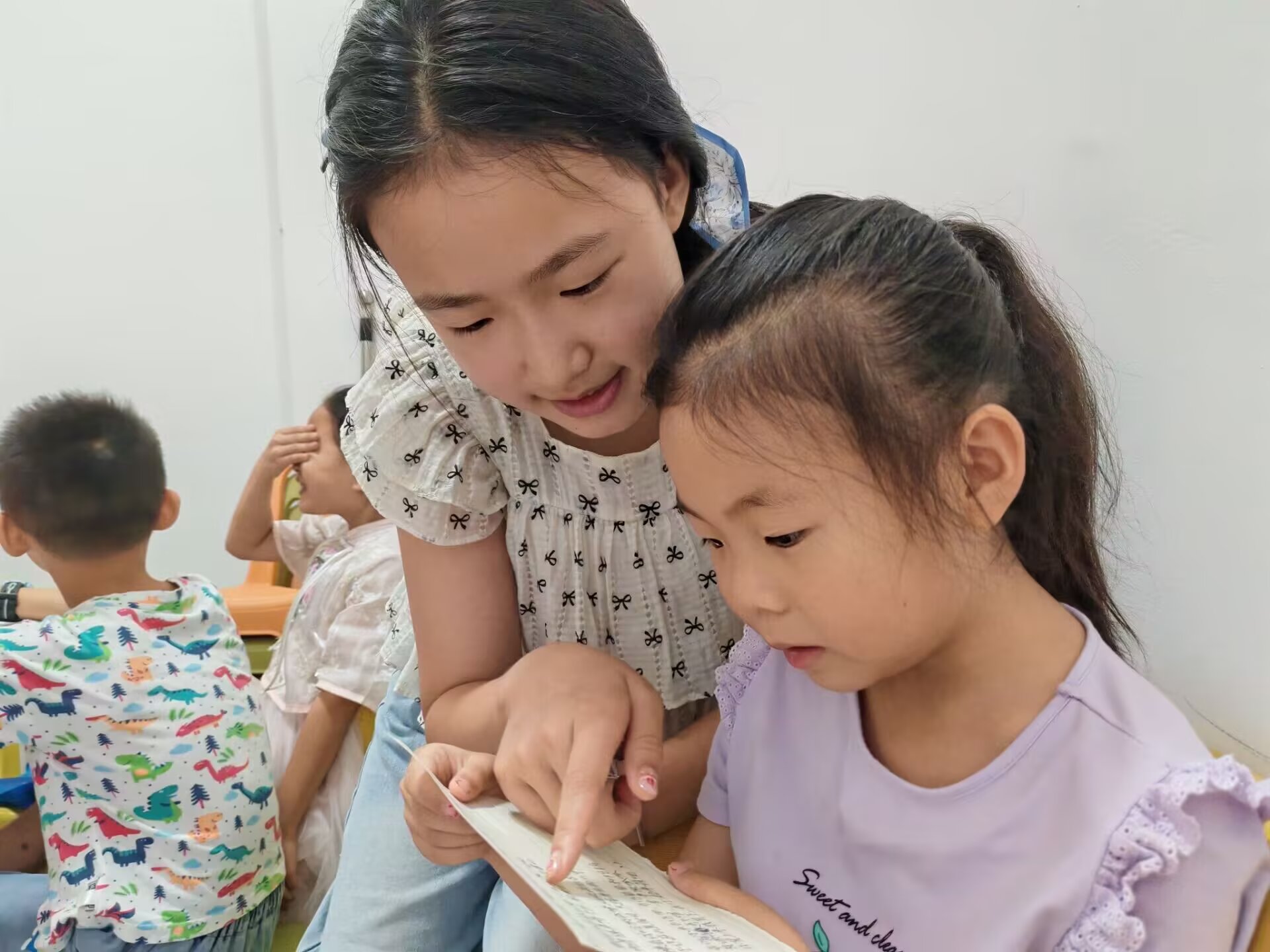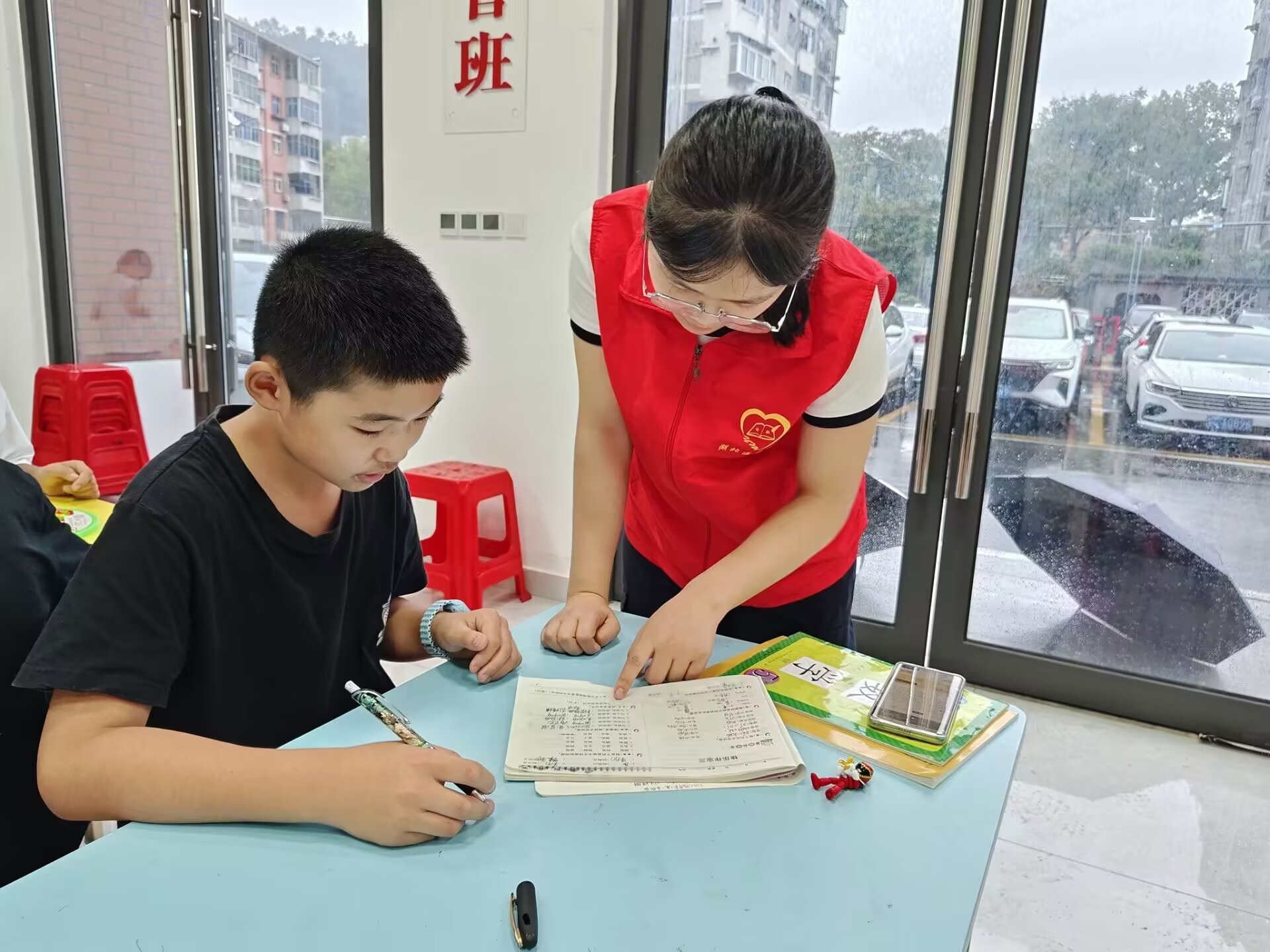 圖為志愿者耐心輔導(dǎo)社區(qū)兒童暑期作業(yè)。李翠姣 攝